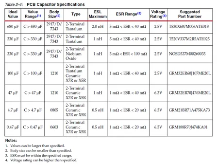 Xilinx gives strict recommendations on the parameters of the capacitors used for decoupling. The following image shows a table with the ESL, ESR and body size limits for the various-valued capacitances.