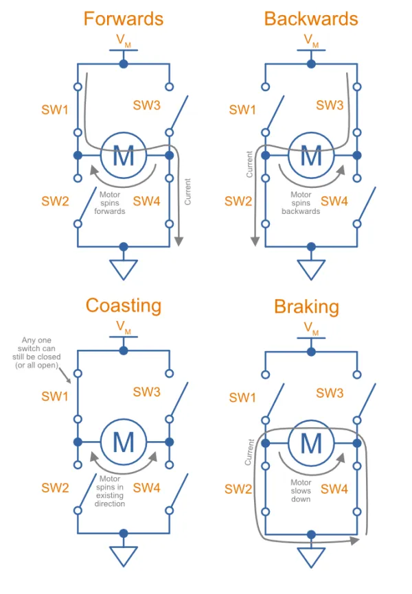 The image below shows the four basic modes of operation you can achieve by turning on and off various switches in the H-bridge. With SW1 and SW4 closed, the supply voltage is applied across the motor in the positive direction and it spins “forwards” (forwards being an arbitrary direction depending on the motor windings). With SW2 and SW3 closed, the supply voltage is reversed across the motor, and it spins in the “backwards” direction. With all switches open (or any one switch closed) the motor is open-circuit and will “coast”, only slowing down due to friction and the load it’s connected to. With SW2 and SW4 closed, the motor short-circuited and will brake, coming to a stop quickly.