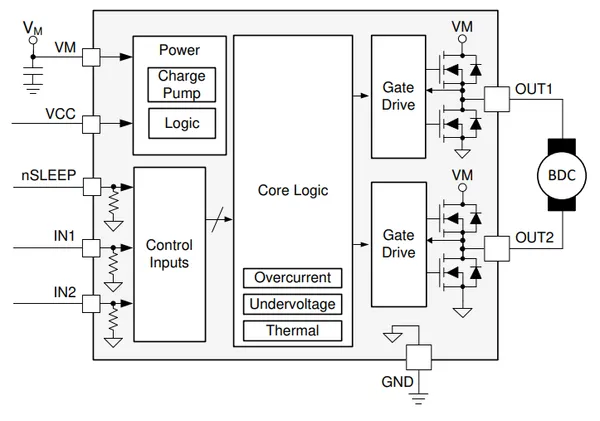 The below image shows the functional block diagram for the DRV8212P motor driver IC. It has internal charge pumps for the gate drives to power the high-side N-Channel MOSFETs, and basic over-current, under-voltage and over-temperature protection. There are two separate power supplies can be provided.  is for the logic and can range from 1.65-5.5V.  is purely for powering the motor and can range from 0-11V3.