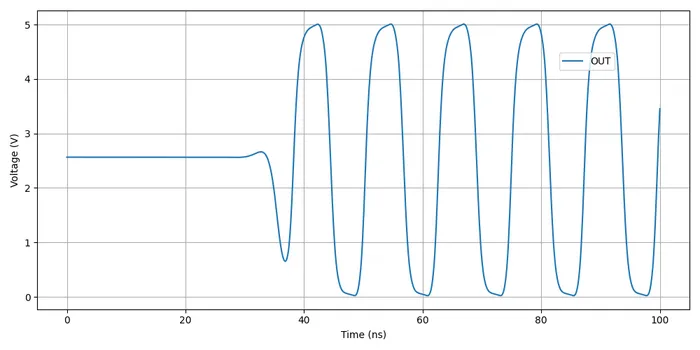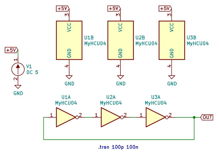 I ran into convergence issues when using the 74HCU04 SPICE model I found floating around on the internet (located in a file called 74HCng.lib). Simulating one instance of the inverter worked fine, but I got the dreaded doAnalyses: TRAN:  Timestep too small error when connecting the second/third/e.t.c inverter in the ring. The convergence issue still occurred even when driving the first inverter instance from a slow frequency PULSE voltage source (rather than the driving it from the output of the last inverter), indicating it wasn’t a problem with the ring structure.
