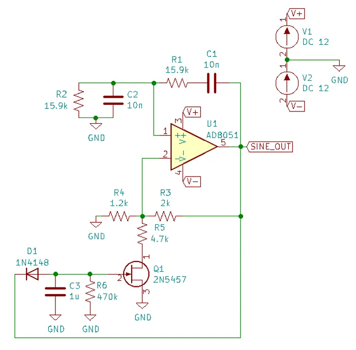 Note the diode and RC circuit controlling the JFET’s gate. When the circuit is first powered up, the gate is at ground and hence the gate-source voltage . Therefore the JFET is almost fully on (remember, JFETs are depletion mode devices), and is in parallel with , increasing the gain of the op-amp. As the output voltage beings to oscillate, on the negative part of the cycle, diode will conduct and charge the RC low-pass filter and with a negative voltage. This will decrease below , which will begin to turn the JFET off. This will then increase the equivalent resistance of in parallel with and decrease the op-amp gain. This will continue until the system reaches a steady-state and oscillates forever.