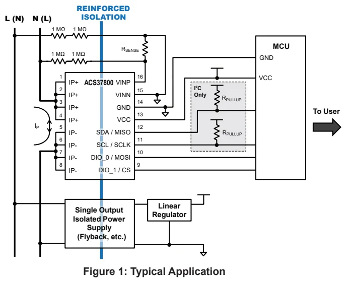 Power monitor ICs are integrated circuits that typically are used to measure mains power (e.g. 110VAC, 230VAC) in an isolated manner and provide digital outputs to a microcontroller. This is a placeholder for the reference: allegro-acs37800-typical-application shows a typical application diagram of a power monitor IC.