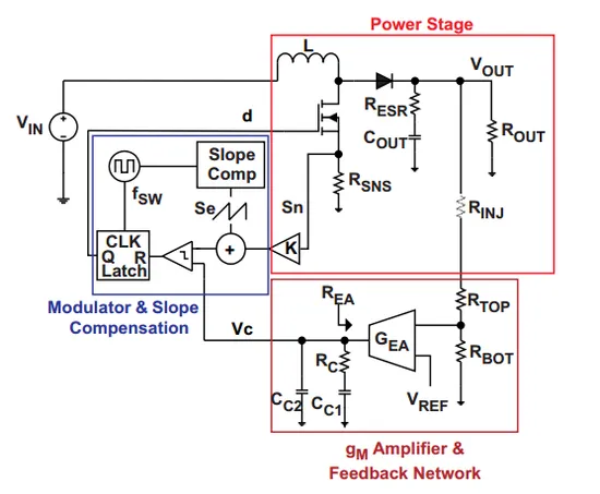 The compensation loop is part of the feedback mechanism. The below diagram shows a current-mode controlled boost converter with a transconductance amplifier () providing the feedback.