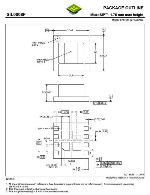 Notice how most of the volume on the module is taken up the chip inductor (the big brown thing that dominates most of the image). The dimensions of the package are shown in the diagram below.