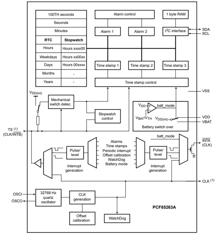 NXP (2023, Nov 22). PCF85263A - Tiny RTC/calendar with alarm function, battery switch-over, time stamp input, and I2C-bus [datasheet]. Retrieved 2024-01-25, from https://www.nxp.com/docs/en/data-sheet/PCF85263A.pdf. ↩ ↩2