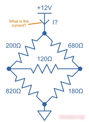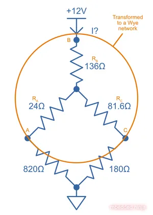 What is the current I drawn from the +12V for this resistor network? This can’t be solved purely with resistors-in-series and resistors-in-parallel equations, but can be done with the help of a Delta To Wye transformation.