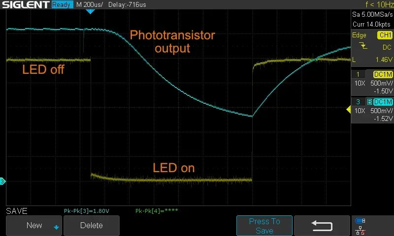 This is a placeholder for the reference: phototransistor-response-to-led shows the response of a Wurth Electronics 1541201NC3060 phototransistor to a light source. The yellow trace represents the LED control signal, where HIGH is OFF and LOW is ON. The blue trace represents the phototransistor output. is . The horizontal time grid is per division, so this is a short pulse. You can see the phototransistor output taking time to respond. This is due to the parasitic capacitance on the output and the low drive strength of the phototransistor. If we left the LED on, the output would eventually settle.
