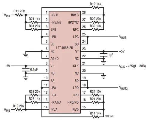 Analog Devices (formally Linear Technology). LTC1068 Series: Clock-Tunable, Quad Second Order, Filter Building Blocks (datasheet). Retrieved 2022-08-29, from https://www.analog.com/media/en/technical-documentation/data-sheets/1068fc.pdf. ↩ ↩2 ↩3