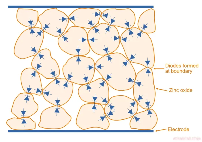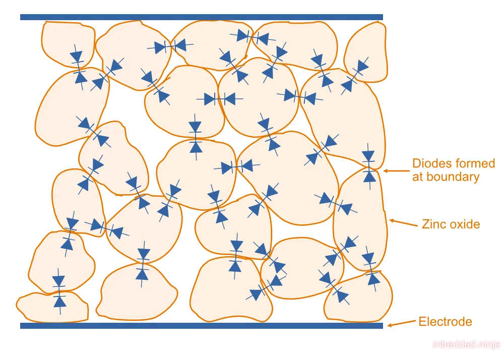 Zinc oxide varistors are made from a sintered matrix of zinc oxide (ZnO) grains with other metal oxide additives, sandwiched between two metal plates which act as the electrodes.1 The zinc oxide grains themselves are highly conductive, while the filler material between the zinc oxide grains is highly resistive. A unique phenomenon occurs at the boundary between two zinc oxide grains. Here, depletion regions form and creates what can be considered as back-to-back zener diodes (using zinc oxide, they have a breakdown voltage of around 3.5V).1 Because the grains are randomly orientated and positioned throughout the varistor, the whole structure can be compared a huge network of diodes connected in various series and parallel configurations (and random polarities)2.