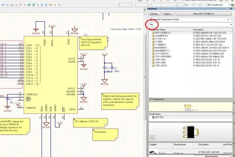 When searching through a library, Altium will only search from the first letter of the component name or the description. This normally makes you search turn up blank. To make Altium search anywhere in those fields, add the asterisk character before the word (e.g. *reg rather than reg).