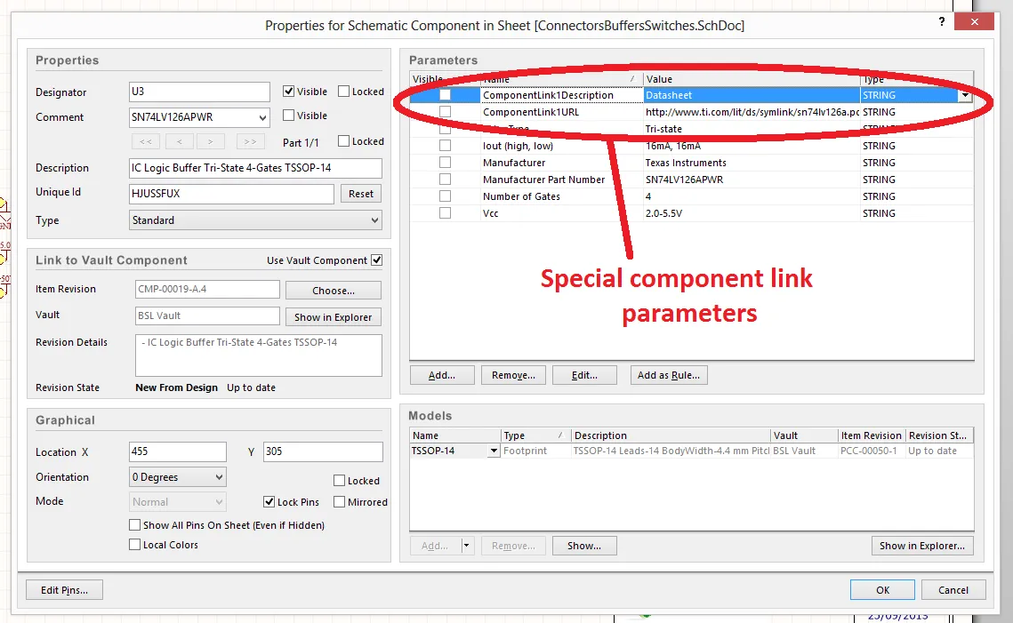 This can be repeated for as many component links as you wish. The URL can be any valid path (i.e. the path to a file on your computer/server, or to a website URL). They can be added to both schematic library component parameters, and component library parameters which will the be released to a vault. The component links get added to the References sub-menu when you right-click on the component in the Altium schematic editor.
