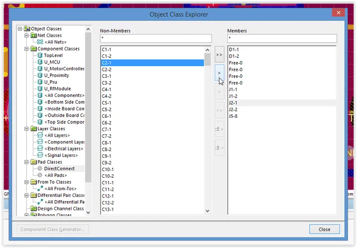 To add pads to a pad class, first take note of the component the pad is part of in the Altium PCB editor, and the pin number of the pad itself (e.g. component J3, pin number 2). Now click Design->Classes. Navigate the folder “Pad Classes”, and add a new pad class called DirectConnect (the exact name does not matter). Now add all the desired pads to this new pad class.