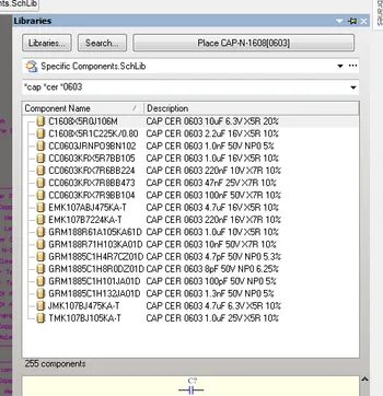 I use the following notation for the description field. The parameters are listed in short-hand from most generic to least generic (this allows for good grouping when sorting alphanumerically). The symbol reference is set the manufacturer’s part number, as this has to be a unique field.
