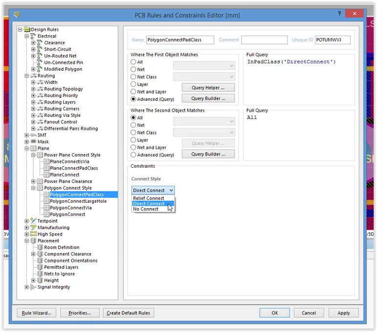 We now need to make a direct connect rule for all pads in this pad class. Click close, and now click Design->Rules. Add a new “Polygon Connect Style” rule. Select “Advanced (Query)” for the first object match, and then enter InPadClass(‘DirectConnect’) into the “Full Query” window. Change the Connect Style to “Direct Connect”.