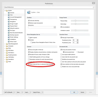 By default, Altium tries to open internet links in it’s own internal browser. It’s no surprise that because Altium is a EDA tool and not a dedicated browser, it’s not the best at displaying web pages. Thankfully, you can force Altium to use your default external web browser by navigating to DXP->Preferences->System->View and checking the “Open internet links in external Web browser” option.