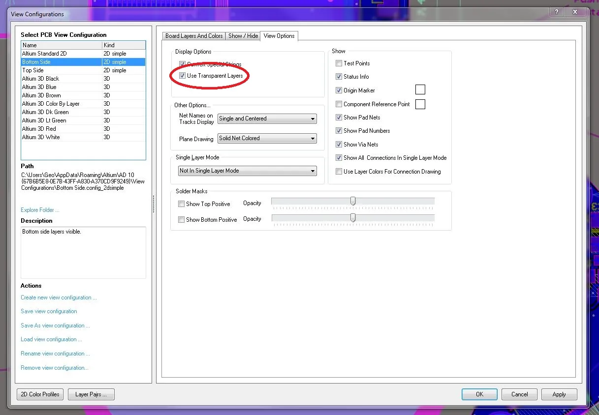 ‘Use Transparent Layers’ is a menu option hidden away in Altium that makes the layers go semi-transparent. It is really useful when dealing/routing with multi-layer objects (such as vias). I found I use Transparent mode more often than not now since I discovered it. To enable it, go into the View Configurations Menu, click the ‘View Options’ tab, and then make sure the ‘Use Transparent Layers’ box is ticked as shown below.