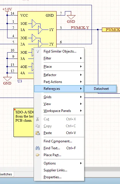 I would then be able to quickly go to the datasheet by right-clicking the component, navigating to the “References” sub-menu, and clicking “Datasheet”.