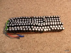 My ‘monster’ cap bank. Me and a mate made this in 2005 for a coil gun. Each capacitor is from a disposable camera. They are 7 rows with 20 capacitors in each, and they are all connected in parallel The voltage is 330V and the capacitance of each ranges from 80-120µF. The total approximate capacitance is 14,000µF. But the poor camera cap charging circuits just couldn’t handle the jandle. So it never got used. Unfortunately as of Jan 2011 it is broken (I think a car ran into it, long story). I might get around to fixing this sometime…