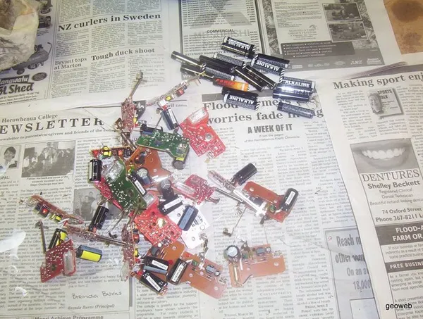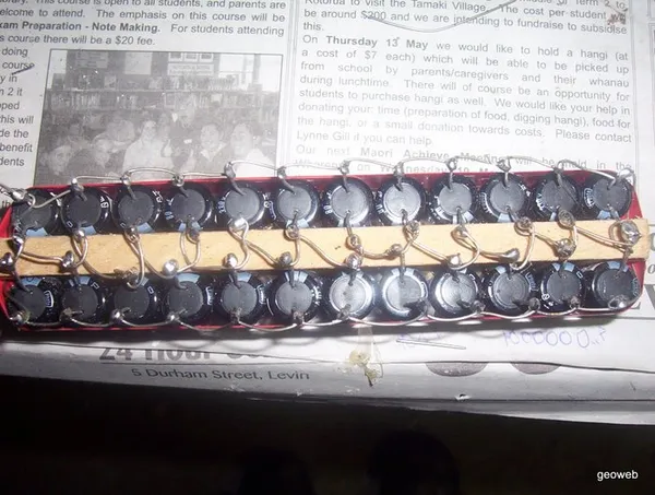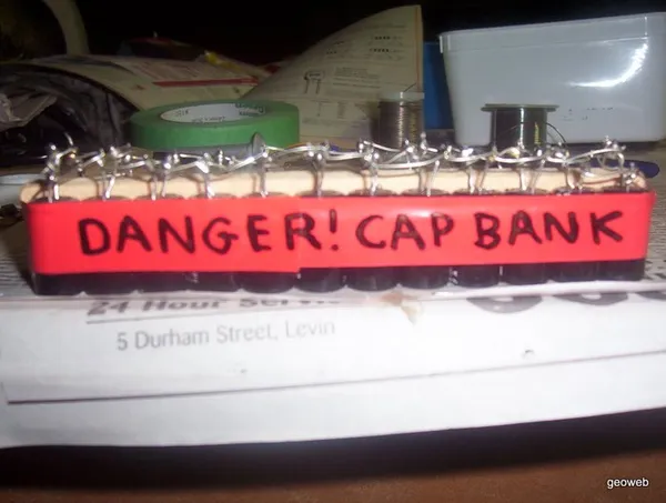 The capacitor bank was built from capacitors scrounged from used disposable flash camera’s. I got the cameras for free from a Kodak photo processing store just by asking nicely :-). Each camera has one 330V electrolytic capacitor ranging from 80 to 120uF. These can easily be unsoldered and hooked together for an el-cheapo capacitor bank.
