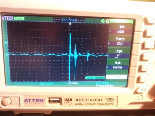 To anyone using an oscilloscope: Mains ripple easily gets it way onto the trace (since it’s really an open circuit), but aslong as you set the trigger to manual and at a high enough voltage, you should be able to catch this spike!