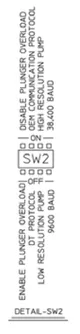 When connecting one motor, a jumper is need on JP7 or JP8. They come shipped with a jumper on JP7. SW1 controls the address of the pump. It should be set from 0x0 (which gives address 0x31) to 0xE (which gives address 0x3F). Setting SW1 to 0xF makes the pump execute a self-test procedure.