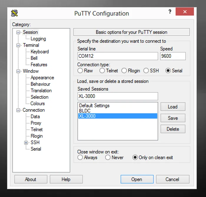 There are two communication protocols, the OEM protocol and the DT (data terminal) protocol. The OEM protocol is more noise resistant, has checksums, and return message formats. The DT protocol is basic and suitable for controlling directly from a data terminal. I used the following settings in the PuTTy terminal. I decided to try the DT protocol.