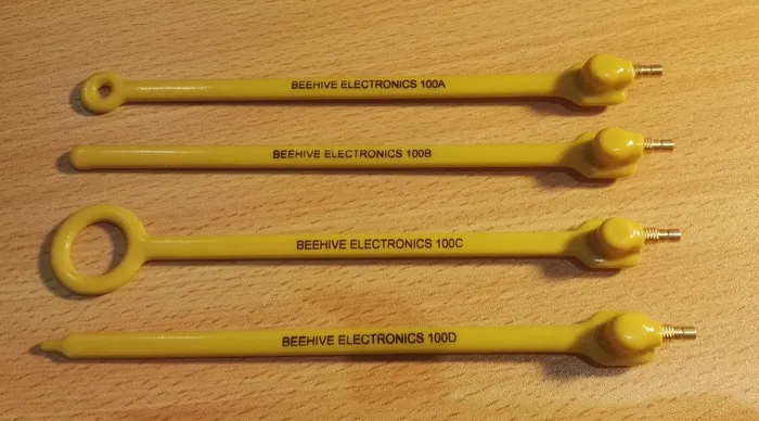 The Beehive Electronics probes set contains three H-field probes (100A, 100B, 100C) and one E-field probe (100D). All are non-contact probes.