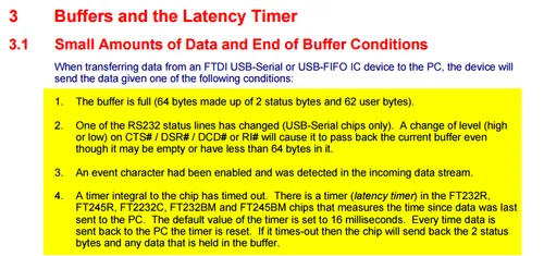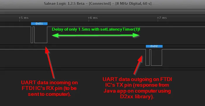 The below image is a screenshot of FTDI RX/TX data captured with a logic analyser. The computer was running Java code which sent an 0x02 response as soon as it received an 0x01 byte.