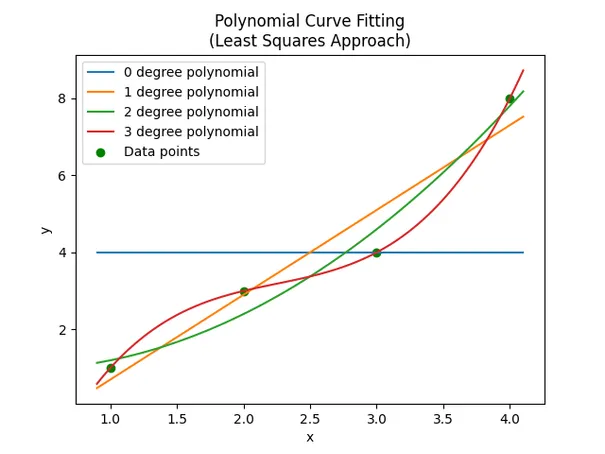\end{bmatrix}  n ∑ x i  ∑ x i 2  ⋮ ∑ x i k   ∑ x i  ∑ x i 2  ∑ x i 3  ⋮ ∑ x i k + 1   ∑ x i 2  ∑ x i 3  ∑ x i 4  ⋮ ∑ x i k + 2   ... ... ... ... ...  ∑ x i k  ∑ x i k + 1  ∑ x i k + 2  ⋮ ∑ x i k + k     a 0  a 1  a 2  ⋮ a k    =  ∑ ( y i  ) ∑ ( x i  y i  ) ∑ ( x i 2  y i  ) ∑ ( x i k  y i  )