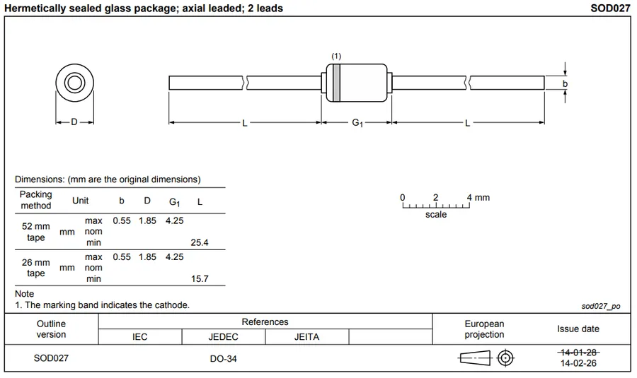 NXP. SOD27 - hermetically sealed glass package; axial leaded; 2 leads. Retrieved 2024-04-09, from https://www.nxp.com/docs/en/package-information/SOD27.pdf. ↩ ↩2 ↩3 ↩4 ↩5