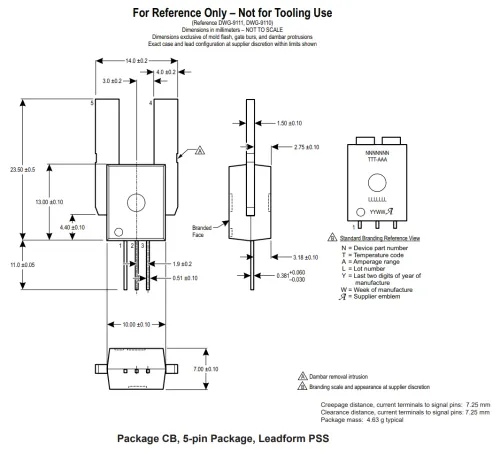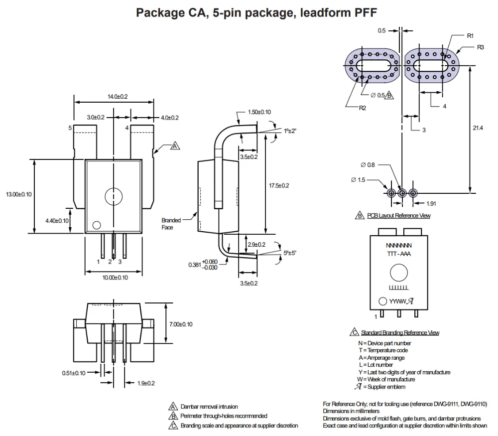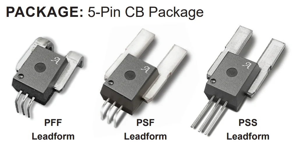 PFF, PSF and PSS are package names used by Allegro MicroSystems for certain through-hole integrated current sensors. Their formal names are CB-PFF, CB-PSF and CB-PSS respectively. This package features large, low-resistance leads for the sensed current path, making them suitable for sensing high currents. They all share the same body dimensions, but have differing lead styles.