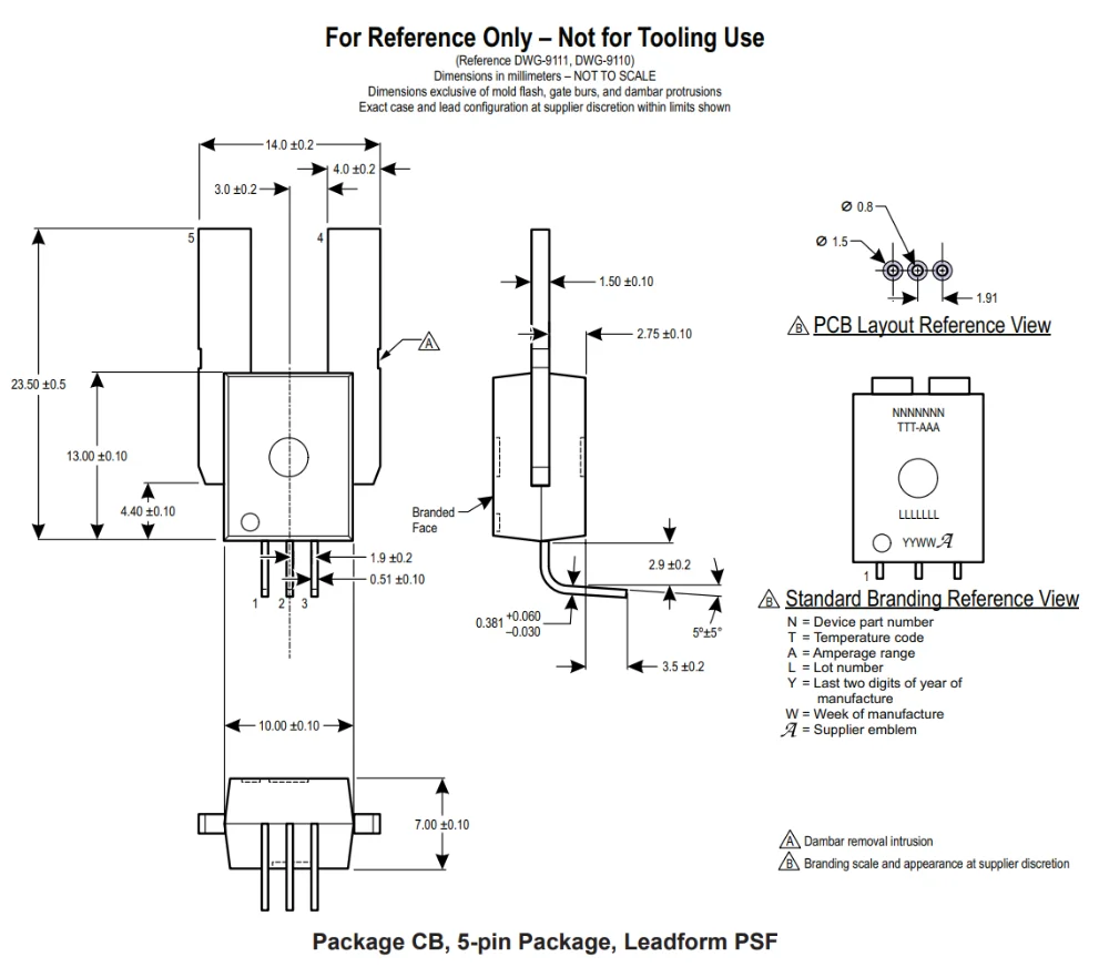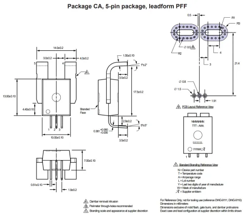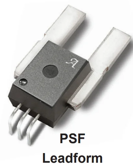 • PSF — Use when you want formed signal leads for the PCB but straight primary terminals—for example to mate with a bus bar, weld, or other mechanical arrangement on the high-current path, while still using plated through-holes for VCC, GND, and output.