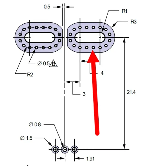 A drawing of the PFF leadform PCB footprint highlighting the recommended perimeter vias.2