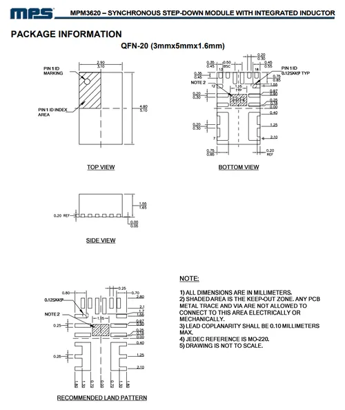 Aside from the unique corner pins that QFN packages can have (as explained above), some QFN packages are completely IC specific and do not follow the “standard” at all. One example is the MPM3620 which comes in a “QFN-20” component package ([^mps-mpm3620-non-standard-qfn-20-component-package]) which has changing pitch, different sized pins, bridged pins and internal pins near the bottom center of the package:
