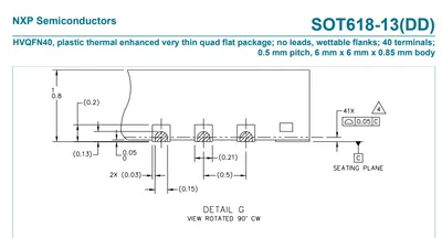 NXP (2018). SOT618-13(DD) HVQFN40, plastic thermal enhanced very thin quad flat package; no leads, wettable flanks; 40 terminals; 0.5 mm pitch, 6 mm x 6 mm x 0.85 mm body. Retrieved 2021-10-28, from https://www.nxp.com/docs/en/package-information/SOT618-13(DD).pdf. ↩