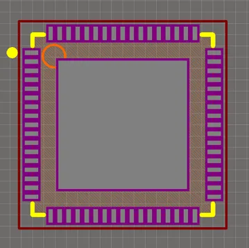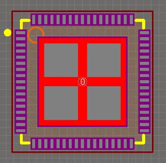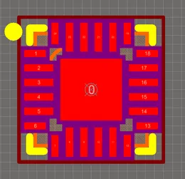 QFN is a family of SMD component packages with typically 12-108 leads. The QFN package is commonly used today for higher lead count ICs such as microcontrollers. It is a near chip-scale package, with all the pins being around the perimeter and an optional thermal pad(s) in the center. It is one of the highest pin-density SMD packages without resorting to BGA. Note that there are different pitch footprints within the QFN family! And QFN packages do not have to be square (square is the most common), some rectangular versions exist with a different number of leads on the two sides (they always have the same number of pins on the opposite side). The image below shows a typical QFN package with an equal number of leads on all sides and an exposed pad.