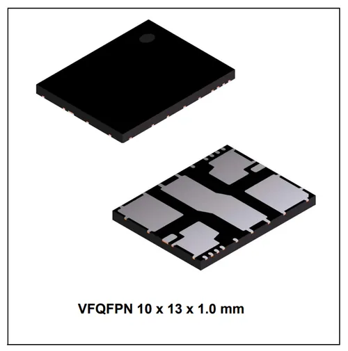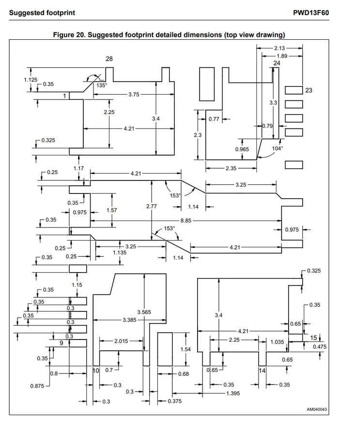 Another great example is ST Microelectronic’s PWD13F60 high-voltage full-bridge with integrated gate driver IC. It comes in a VFQFPN 10x13x1.0mm package which contains a variety of pad shapes and sizes, as shown in the below image: