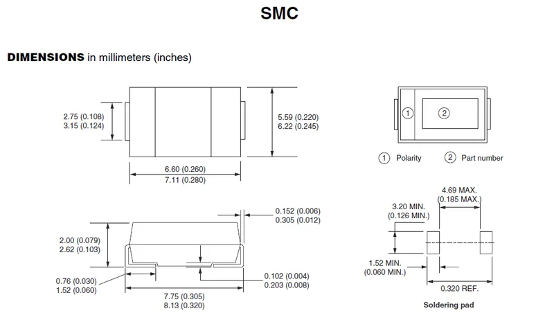 SMC is a 2-lead SMD component package. It is also commonly known as DO-214AB. It is the largest package in the family containing SMA, SMB, and SMC. It is used for diodes that require good heatsinking requirements and/or high-surge current capabilities. Used for general purpose, schottky, and TVS diodes.