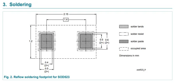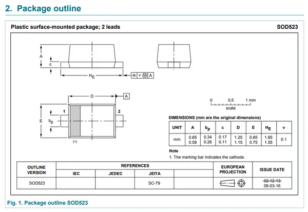 NXP (2022). SOD523 plastic surface-mounted package; 2 leads (package information). Retrieved 2022-03-24, from https://www.nxp.com/docs/en/package-information/SOD523.pdf. ↩ ↩2 ↩3 ↩4