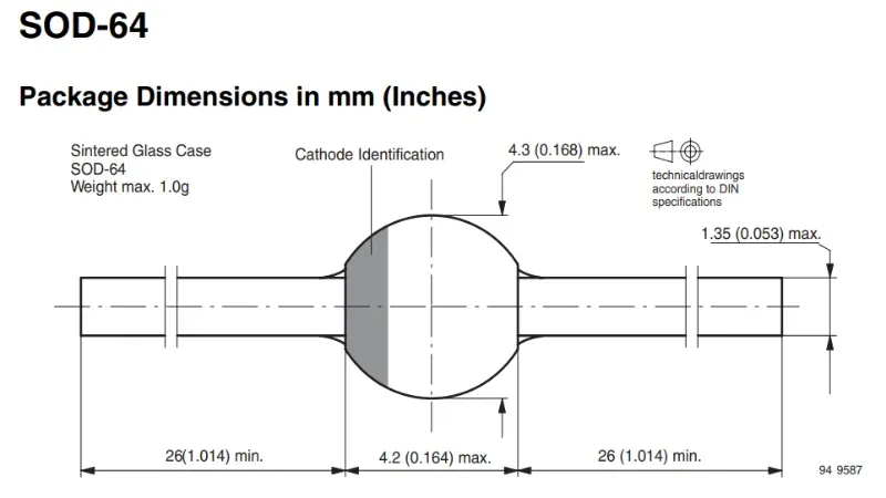 Vishay (2003, Dec 9). SOD-64 - Package Dimensions in mm (Inches). Retrieved 2024-11-29, from https://www.vishay.com/docs/84009/84009.pdf. ↩