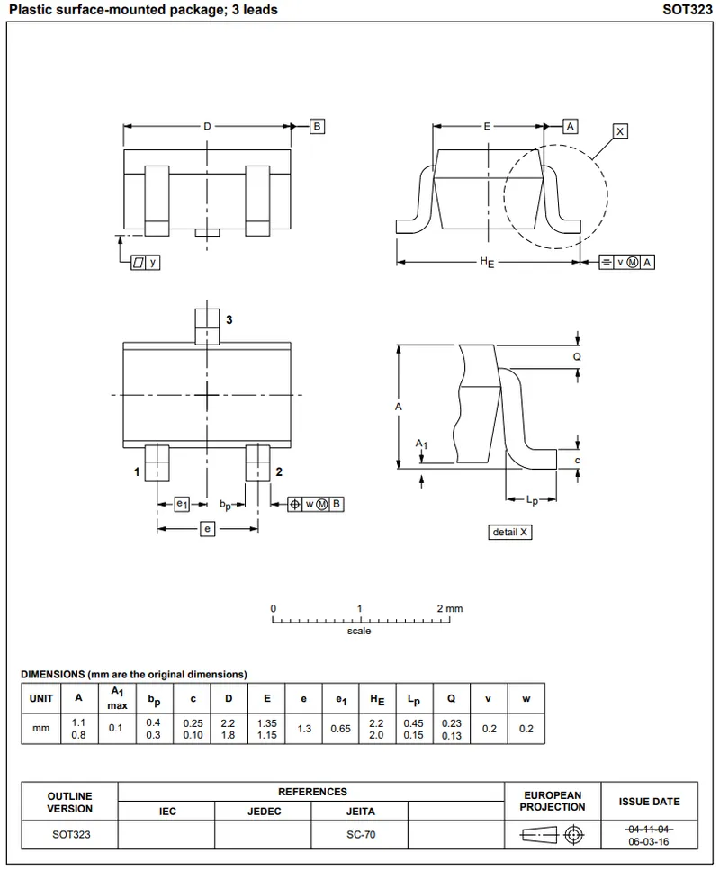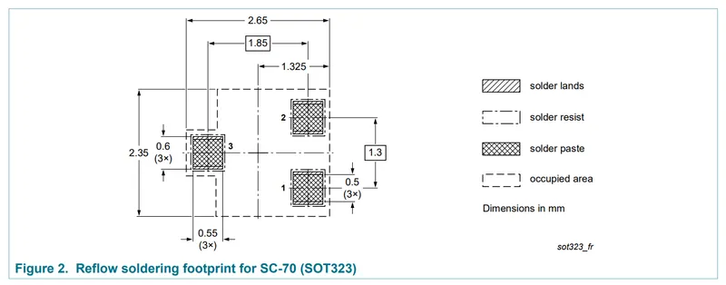 NXP (2019, Jul 29). SOT323 - plastic, surface-mounted package; 3 leads; 1.3 mm pitch; 2mm x 1.25 mm x 0.95 mm body. Retrieved 2024-04-19, from https://www.nxp.com/docs/en/package-information/SOT323.pdf. ↩ ↩2 ↩3 ↩4