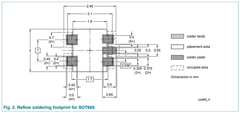 A recommended footprint (land pattern) for the SOT-665 component package is shown below: