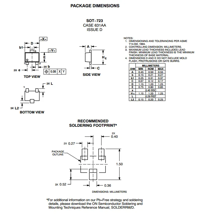 Here are the dimensions and a recommended footprint for the SOT-723 component package.
