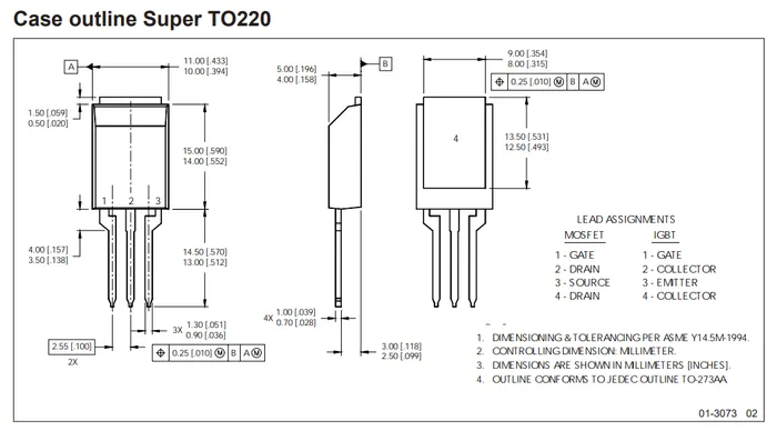 The TO-273AA (also known as the Super-220) can be considered a variant of the TO-220 which replaces the screw-mounted design of the TO-220 with a clip-mounted design. Because of the clip, this package can usually achieve lower junction-to-ambient thermal resistances, hence the “Super”. It is used by International Rectifier.