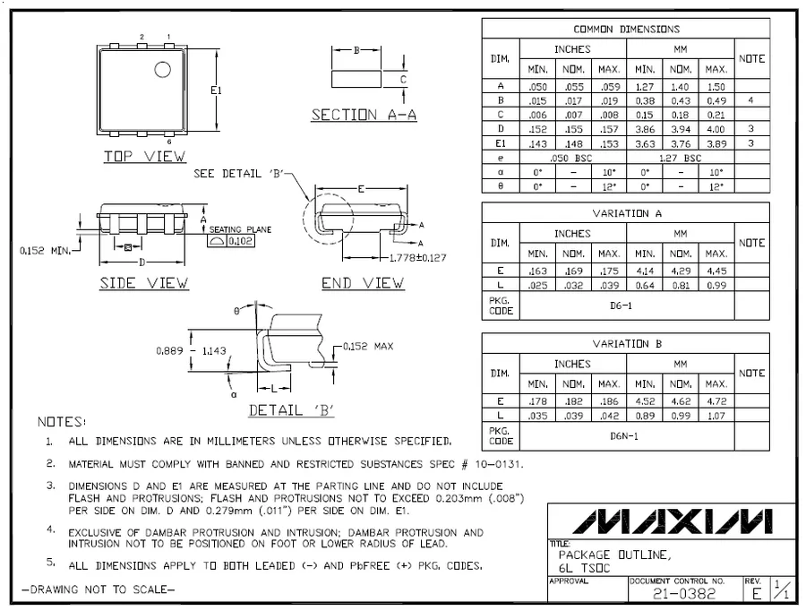 As far as I can tell, this package only comes in the 6-pin version (TSOC-6), and is only used by Dallas/Maxim (since 2001, Dallas has been a subsidiary of Maxim). While Maxim Integrated lists four different variants (see the Title section of the recommended land patterns below), there seems to be no physical difference between the D6+1 and D6-1 variants, and no difference between the D6N+1 and D6N-1 variants. The difference between the variants with and without N in their name are the package width and the lead length (and hence two slightly different land patterns).