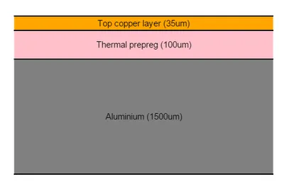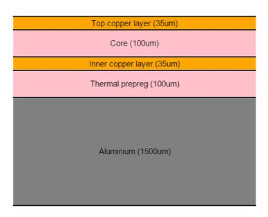 This is the most basic and cheapest IMS PCB design layout. It consists of one electrical layer sandwiched to a metallic substrate with some prepreg in-between. It is commonly used for basic high-power LED PCBs and other simple circuits which don’t require too much routing.