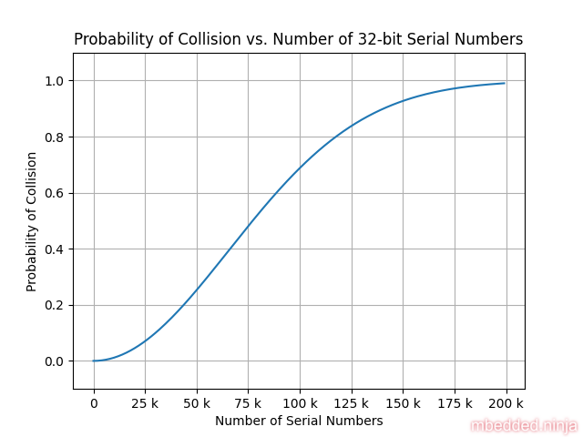 What to consider when choosing serial numbers of embedded products, including the probability of a collision when using random serial numbers.