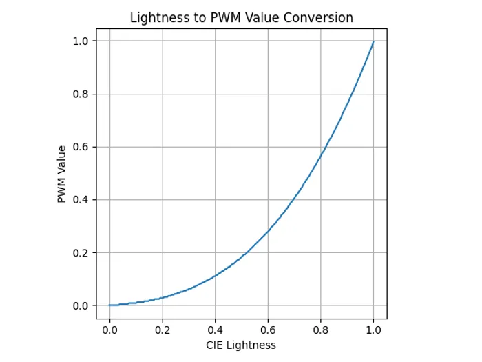const uint16_t CIE_LIGHTNESS_TO_PWM_LUT_256_IN_10BIT_OUT[] = {    0,    0,    0,    1,    1,    2,    2,    3,    3,    4,    4,    4,    5,    5,    6,    6,    7,    7,    8,    8,    8,    9,    9,   10,   10,   11,   11,   12,   12,   13,   14,   14,   15,   15,   16,   17,   17,   18,   19,   20,   20,   21,   22,   23,   24,   24,   25,   26,   27,   28,   29,   30,   31,   32,   33,   34,   35,   36,   38,   39,   40,   41,   42,   44,   45,   46,   48,   49,   50,   52,   53,   55,   56,   58,   59,   61,   62,   64,   66,   67,   69,   71,   73,   74,   76,   78,   80,   82,   84,   86,   88,   90,   92,   94,   96,   98,  101,  103,  105,  107,  110,  112,  115,  117,  120,  122,  125,  127,  130,  132,  135,  138,  141,  143,  146,  149,  152,  155,  158,  161,  164,  167,  170,  173,  176,  180,  183,  186,  190,  193,  196,  200,  203,  207,  211,  214,  218,  222,  225,  229,  233,  237,  241,  245,  249,  253,  257,  261,  266,  270,  274,  278,  283,  287,  292,  296,  301,  305,  310,  315,  320,  324,  329,  334,  339,  344,  349,  354,  359,  365,  370,  375,  380,  386,  391,  397,  402,  408,  414,  419,  425,  431,  437,  443,  449,  455,  461,  467,  473,  479,  485,  492,  498,  505,  511,  518,  524,  531,  538,  545,  551,  558,  565,  572,  579,  586,  594,  601,  608,  616,  623,  631,  638,  646,  653,  661,  669,  677,  685,  693,  701,  709,  717,  725,  733,  742,  750,  759,  767,  776,  784,  793,  802,  811,  820,  829,  838,  847,  856,  865,  875,  884,  893,  903,  913,  922,  932,  942,  952,  962,  971,  982,  992, 1002, 1012, 1023,};See how there is far less identical outputs at the start of the LUT when using a 10-bit output? Only the first three lightness values map to a 12-bit PWM of 0, rather than the first 10 when using a 8-bit PWM.