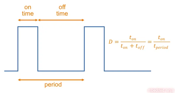 PWM is a digital signal with a fixed frequency but an adjustable on-time (hence the “width modulation”). The duty cycle is the time the signal is on compared to the total period of the signal.