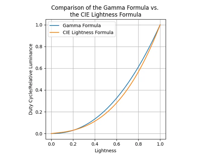 Instead of the CIE lightness function for linearize perceived brightness, some people use the gamma function instead. The gamma function was designed to convert from a CRT voltage to the luminance4. It just happens that the Gamma function is very similar to the CIE lightness formula above and gives you “good enough” results in many cases.